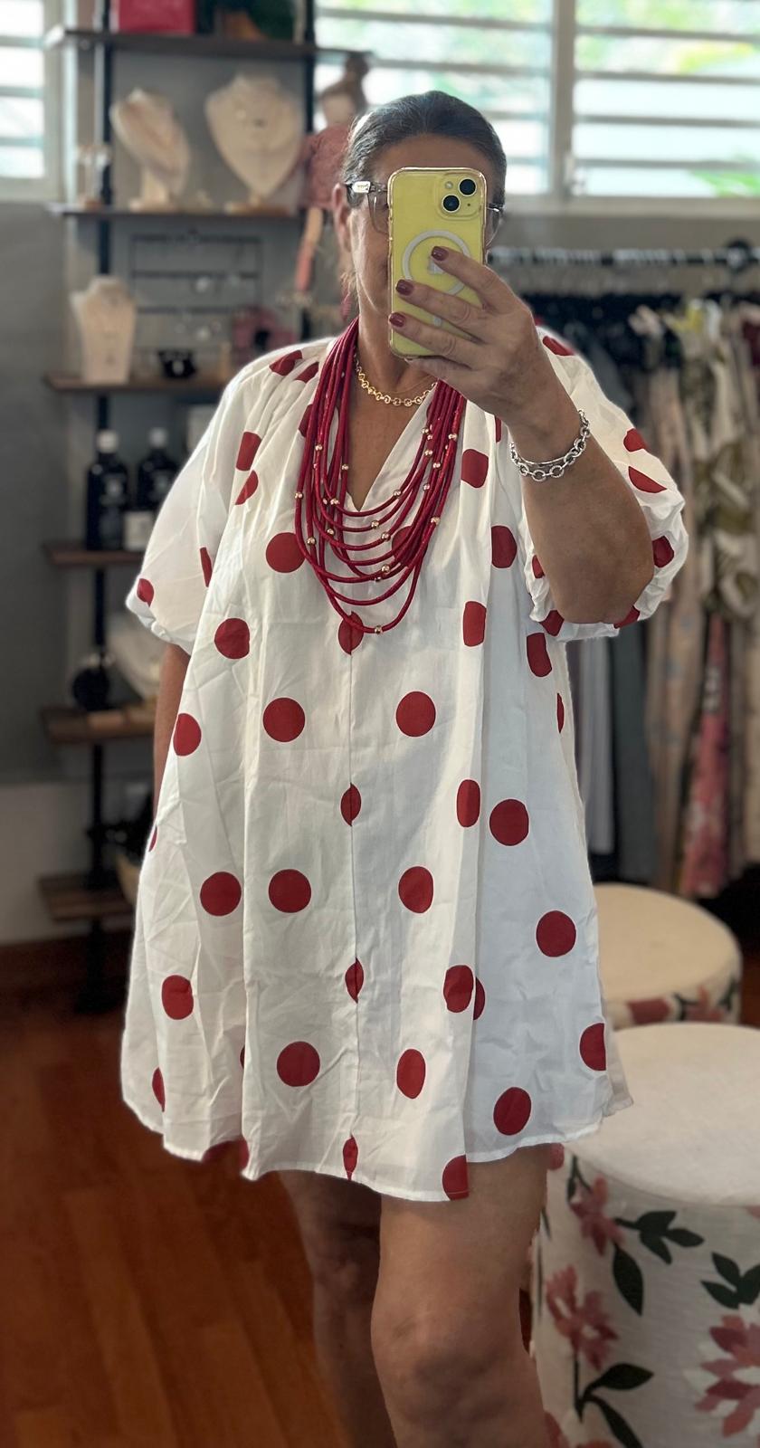 Puss sleeve mini shift dress. 100% cotton. Ines is wearing a Large.