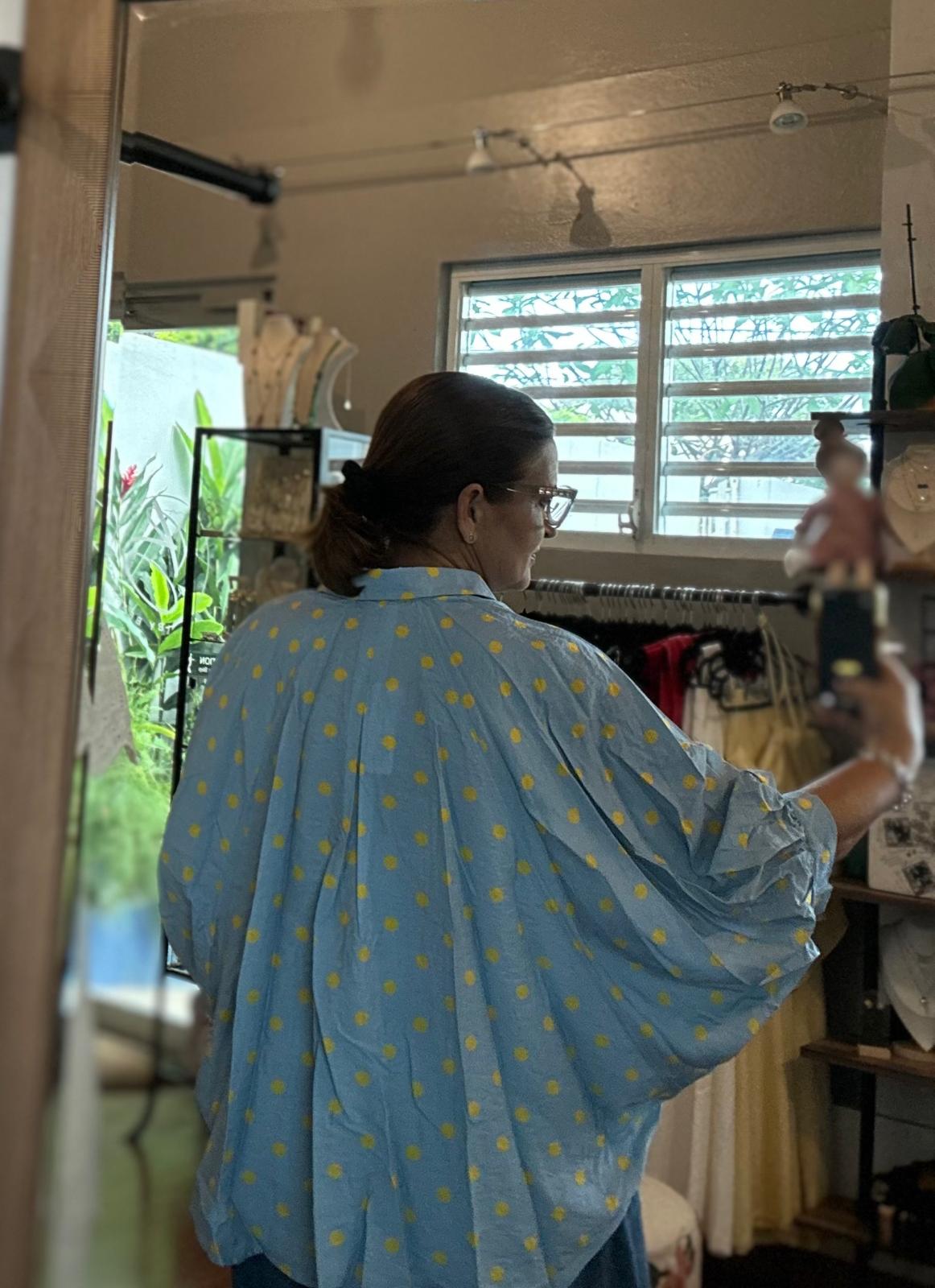 Button front oversized polka-dot blue shirt. Ines is wearing a Large.