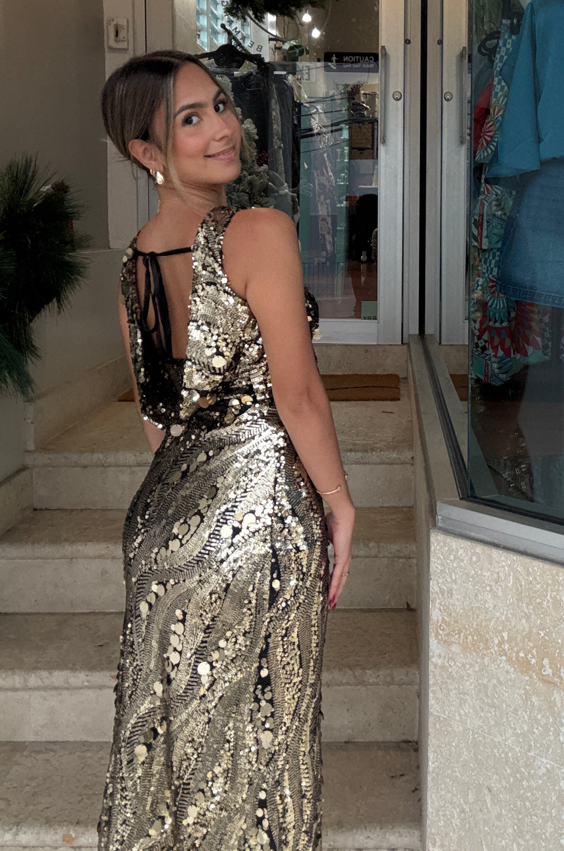 Elegant glitter dress with low back and stretchable fabric, perfect for parties and events