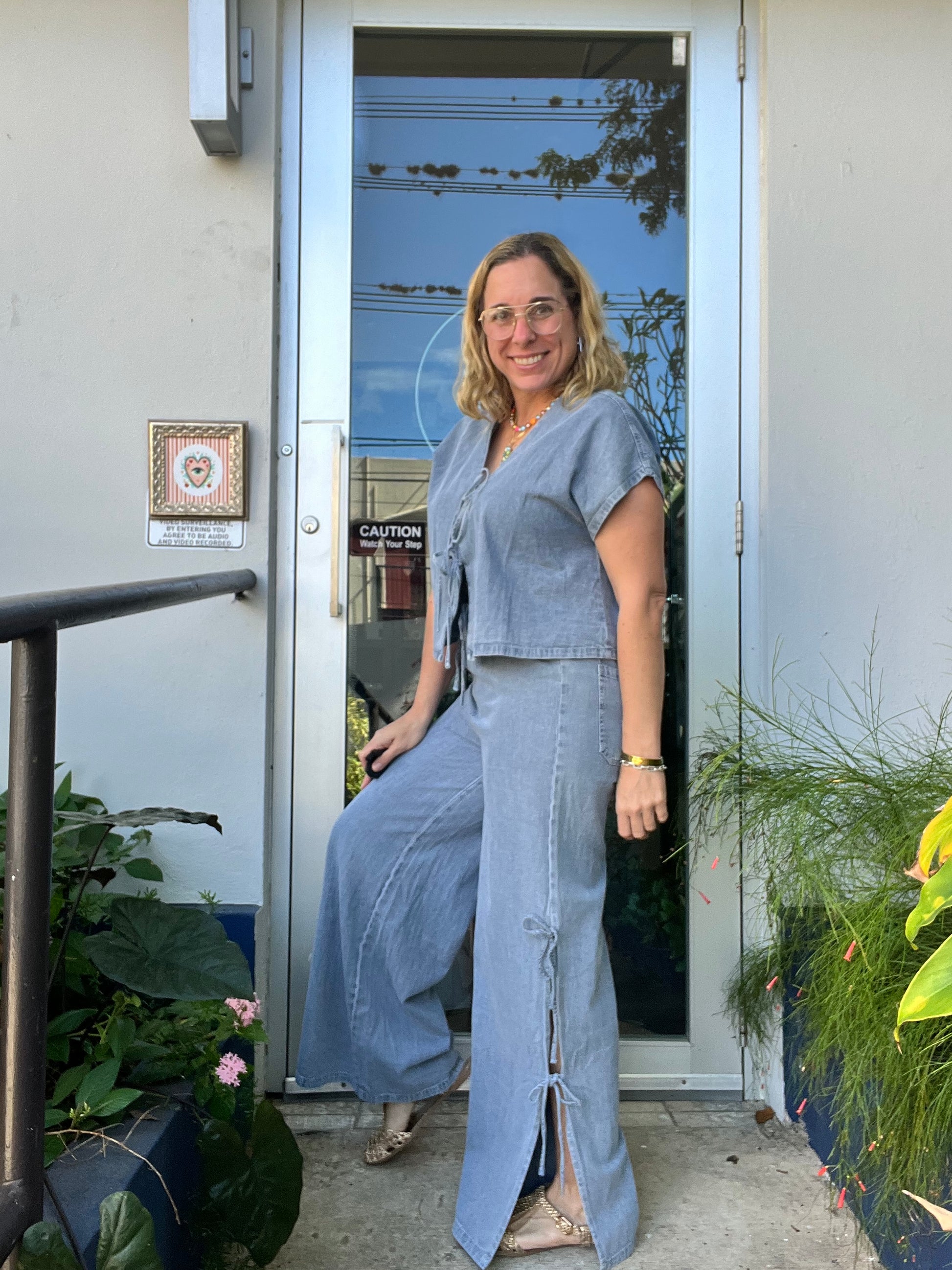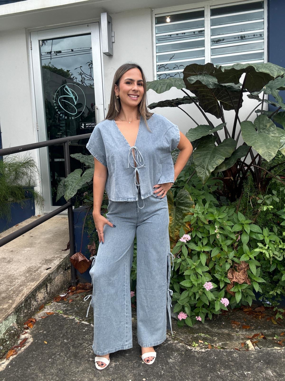 Denim tied on the side pants. Matches with Laced Denim Top.