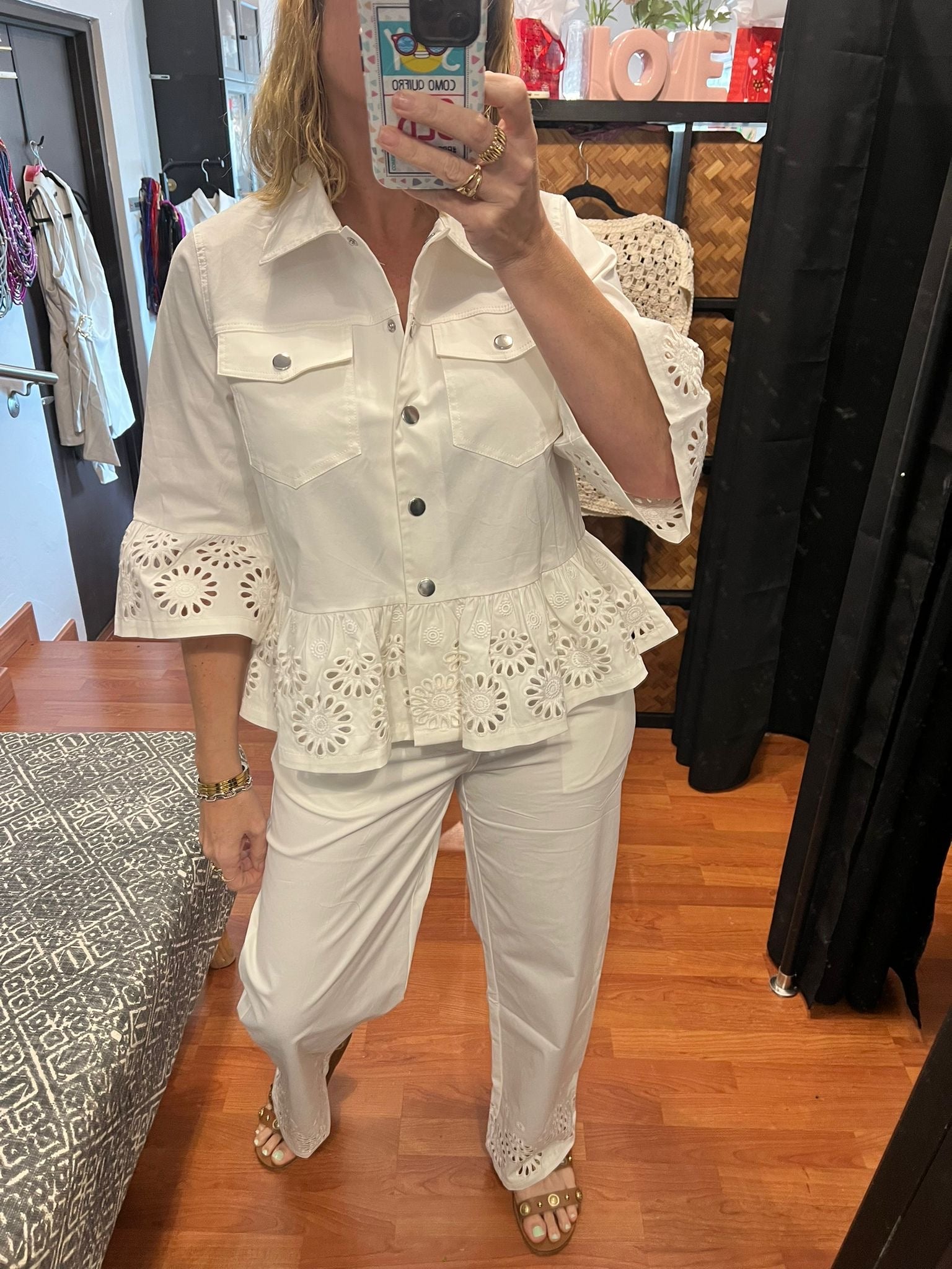 Set de manga al codo y pantalón al tobillo, con detalles de encaje en los bordes. Bea usa uno size medium.