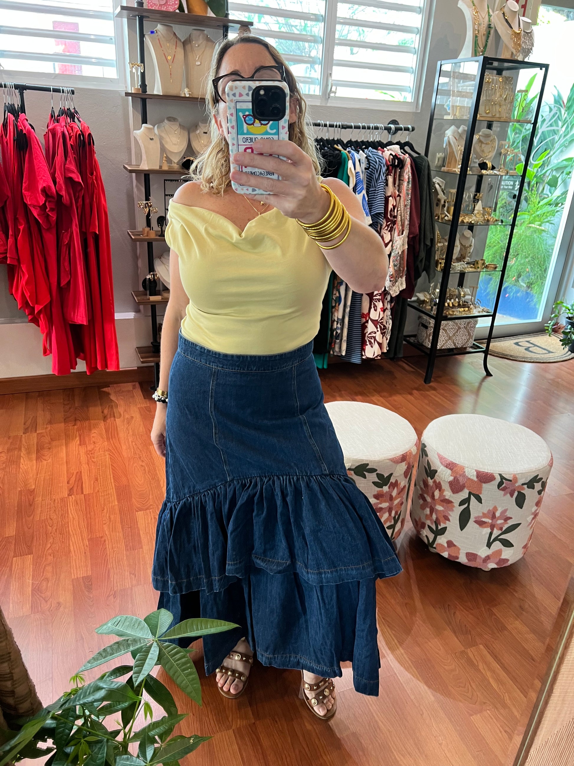 Hi-lo índigo denim midi skirt.